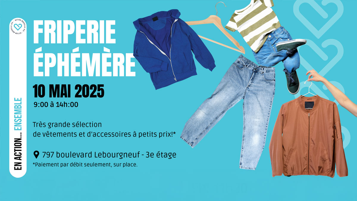 Nous vous invitons à découvrir notre friperie éphémère qui aura lieu le samedi 10 mai, au 797 boulevard Lebourgneuf, 3e étage, de 10h à 14h.