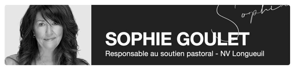 Pasteure Sophie est mariée à Stéphane depuis 2009. Ils ont trois enfants et deux petits-enfants. Elle est responsable du soutien pastoral à Nouvelle Vie Longueuil. Sa passion est d’accompagner les gens à travers les saisons difficiles de leur vie.