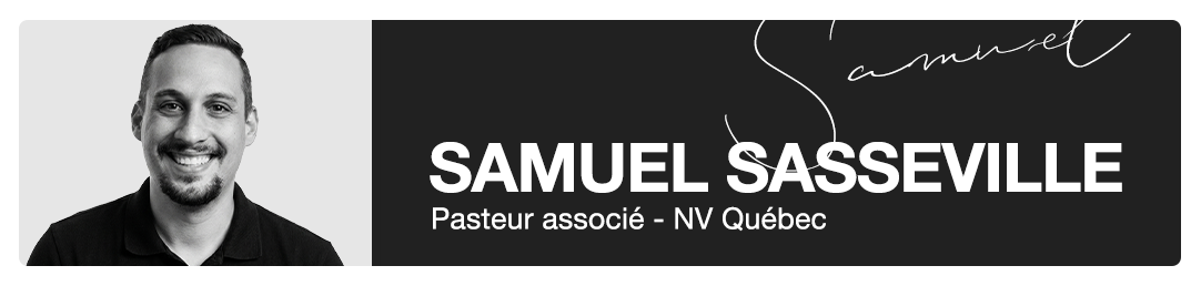 Samuel Sasseville est marié à Jey Sasseville depuis 2018, et ensemble ils ont trois garçons. Il est pasteur associé à Nouvelle Vie Québec et a à cœur de former des disciples de Jésus-Christ.